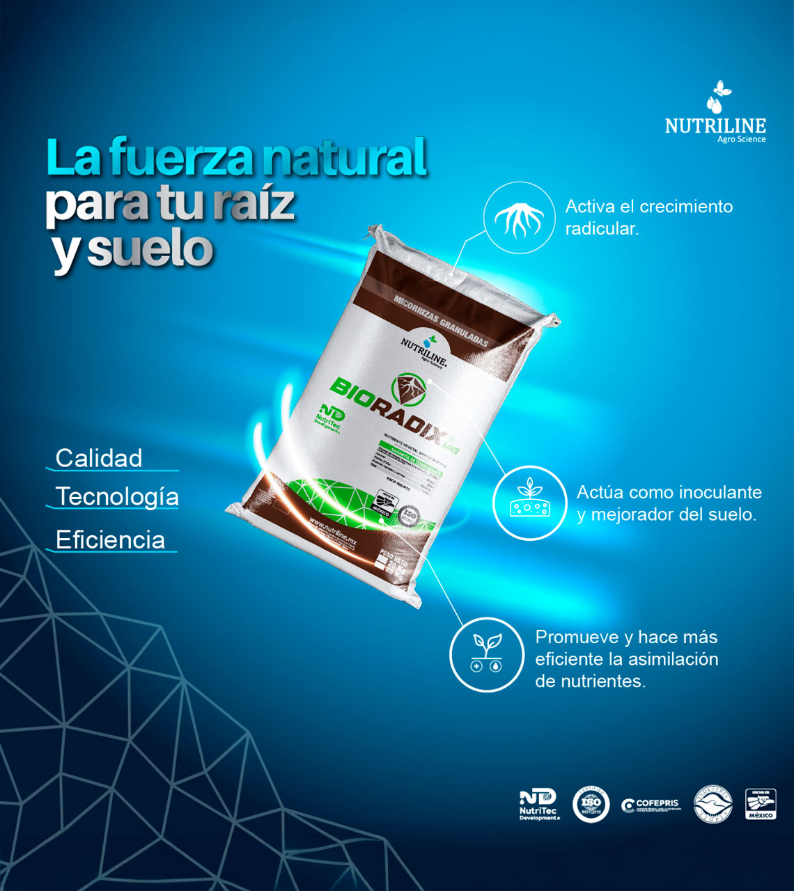 BIORADIX MG® is a powerful advanced root bioactivator that acts as an inoculant and soil enhancer, developed with NutriTec Development® technology. Formulated with spores of arbuscular mycorrhizal fungi (AMF), it promotes efficient phosphorus and nutrient uptake, improves resistance to pathogen attacks, and enhances tolerance to adverse climatic conditions. Additionally, it provides phosphorus, calcium, zinc, and humic acids, optimizing soil structure, the water/air balance in the rhizosphere, and increasing microbial activity.