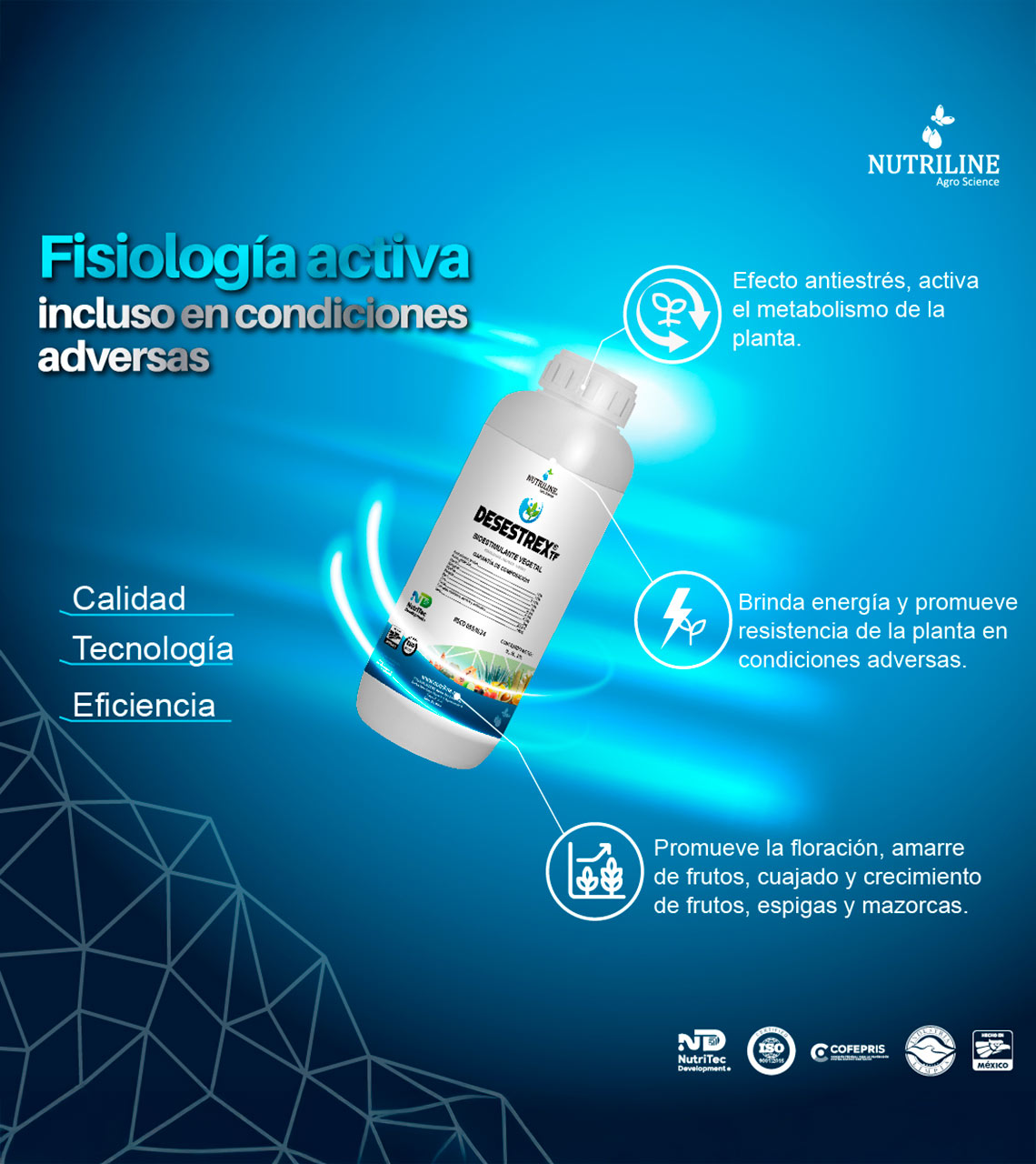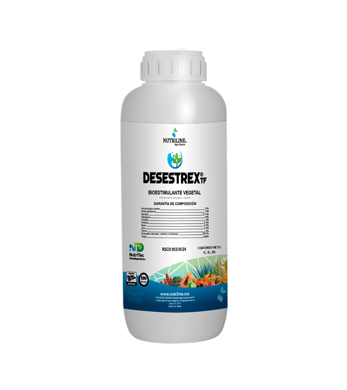 DESESTREX TF® is a foliar biostimulant and anti-stress agent that acts as a physiological bioactivator for plants, combining a balanced formula of phytohormones, macronutrients, micronutrients, and carriers, developed with NutriTec Development® technology. It stimulates and induces efficient physiological development in crops during the main phenological stages. Thanks to its nutritional and hormonal balance, it allows crops to express their maximum genetic potential, even under adverse climatic conditions.