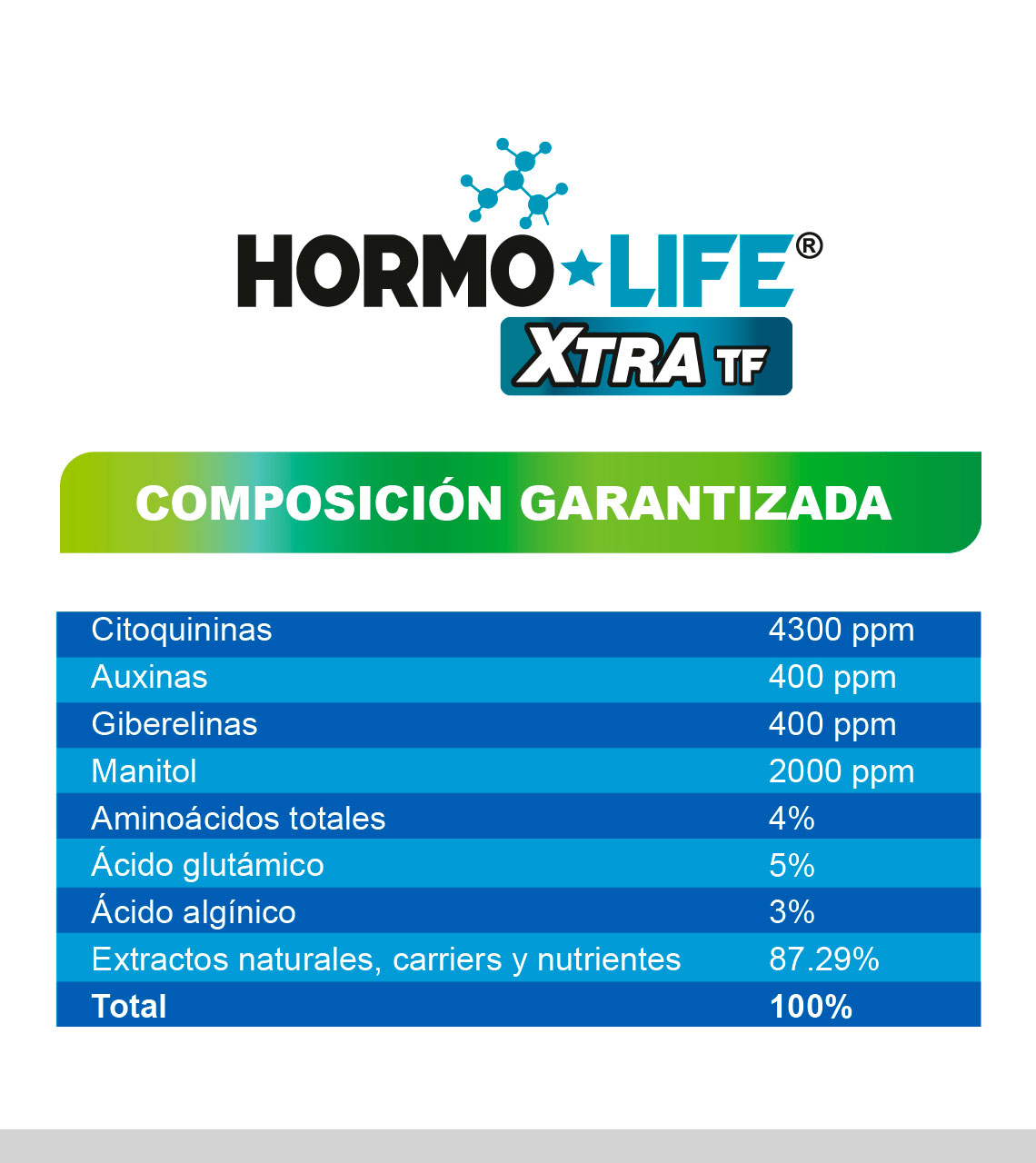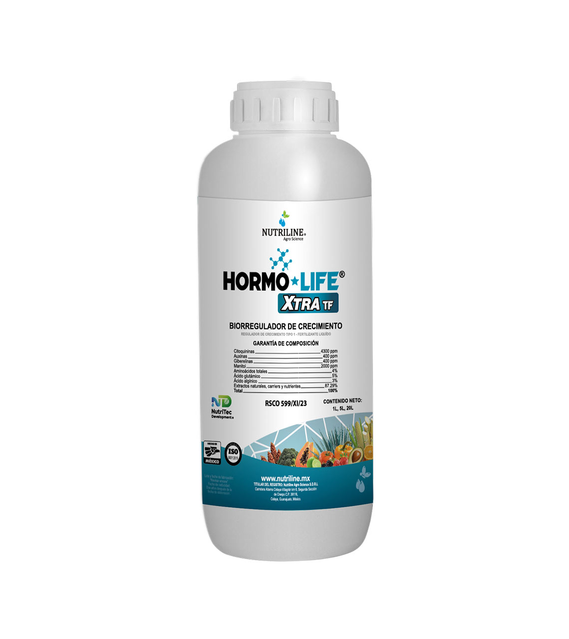 HORMO LIFE XTRA TF® is an innovative growth bioregulator formulated with NutriTec Development® technology. It is composed of a high content of biostimulants that reduce energy expenditure. Its formula, rich in cytokinins and mannitol, promotes the growth and ripening stages of fruits in crops, resulting in higher yield and improved harvest quality.