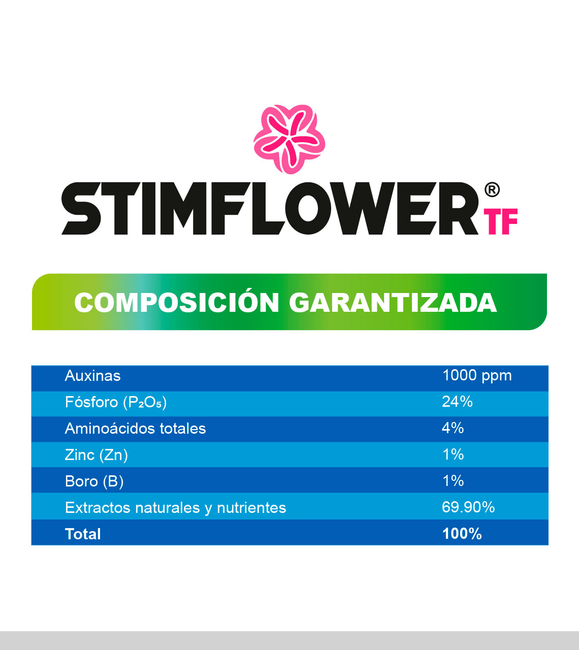 STIMFLOWER TF® is a concentrated liquid nutrient inducer designed for pre-flowering and flowering stages, formulated with advanced NutriTec Development® technology and ideal for foliar application. Its advanced formulation, based on phytohormones, phosphorus, essential micronutrients, energizers, and nitrate reducers, promotes and induces the pre-flowering and flowering phenological stages in plants.