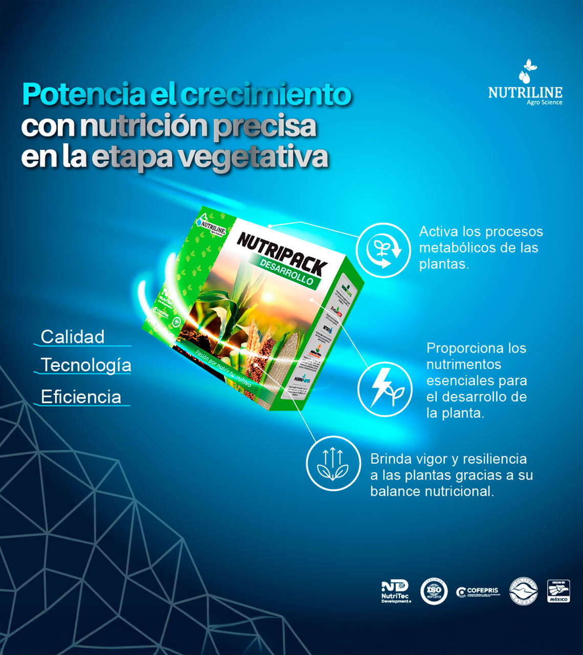 Es un paquete diseñado con tecnología NutriTec Development® a base de bioestimulantes y nutrientes esenciales para la aplicación en distintos cultivos.