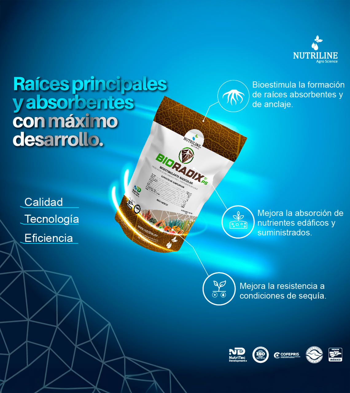 BIORADIX PS® es un bioestimulante radicular en polvo soluble formulado con tecnología NutriTec Development®, contiene una alta concentración de auxinas que llevan a cabo un sinergismo con un grupo de aminoácidos específicos, vitaminas y un elavado aporte de fósforo. Esta combinación bioestimula la formación de raices absorbentes y raices principales.