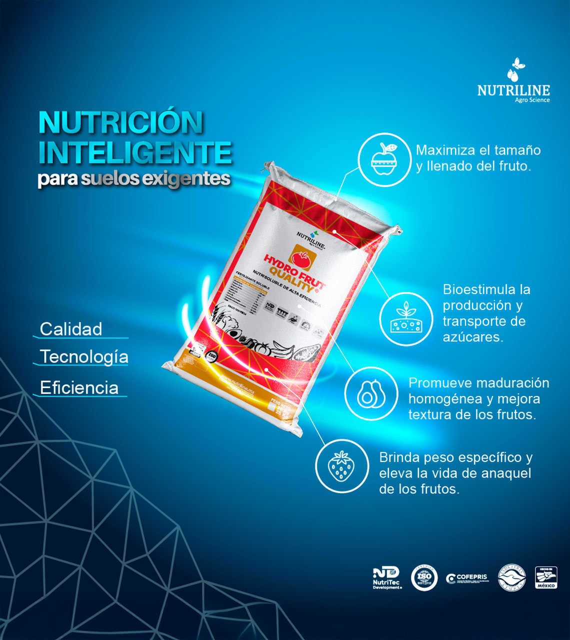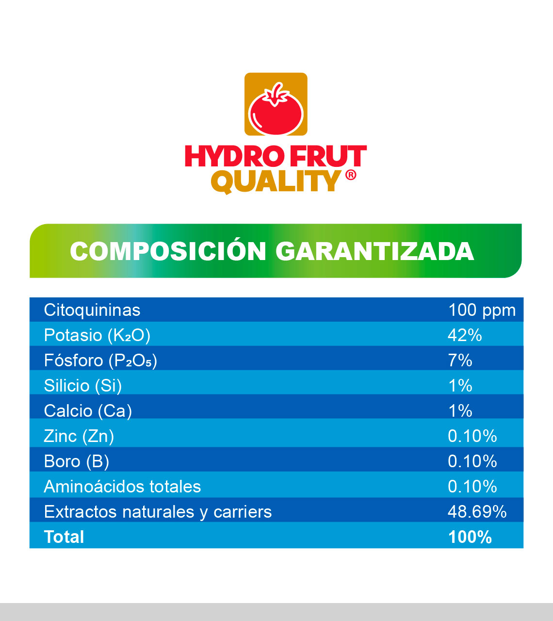 HYDRO FRUT QUALITY® es un nutrisoluble de alta eficiencia formulado con tecnología NutriTec Development®. Contiene una elevada concentración de potasio, fósforo, y silicio ofrece un balance adecuado de calcio, zinc, boro y aminoácidos, todos en forma quelatada. Además, incluye activos que protegen su fórmula en rangos extremos de pH.