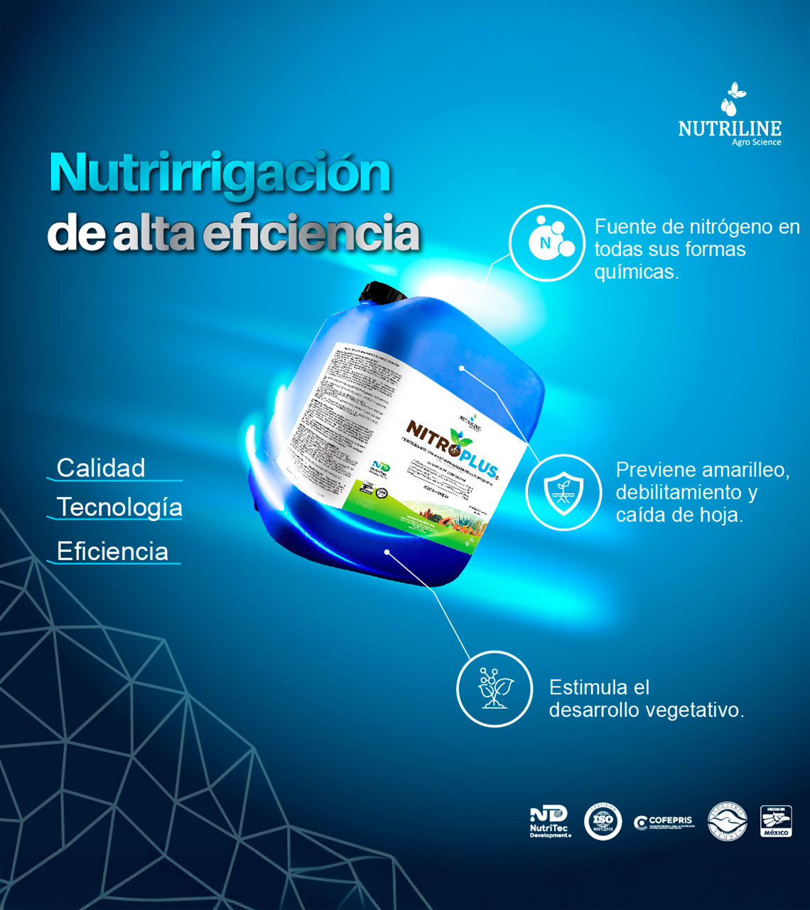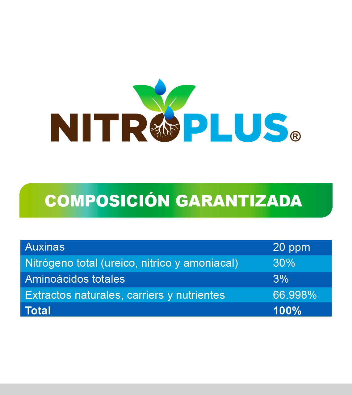 NITROPLUS® es un fertilizante orgánico líquido formulado con la tecnología NutriTec Development®, diseñado para la aplicación al suelo. Es una fuente de nitrógeno en todas sus formas químicas de uso agrícola: nítrica, amoniacal y ureica. Esto proporciona un equilibrio para mantener una presencia adecuada de nitrógeno en una forma más disponible y prolongada durante su uso, de acuerdo al programa de nutrición vegetal. Además, NITROPLUS® está enriquecido con hierro, zinc y carriers orgánicos. Contiene fitohormonas que aceleran la formación y multiplicación celular, estimulando el desarrollo vegetativo y un crecimiento saludable de la planta.