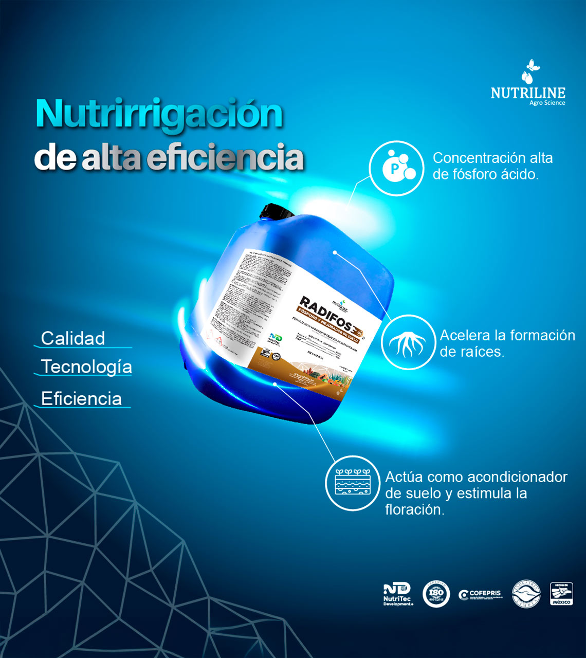 Radifos 50® es un fertilizante líquido que contiene fósforo en forma ácida, diseñado para ser aplicado radicularmente. Este producto esta desarrollado con tecnología NutriTec Development®. Su fórmula acelera significativamente la formación de raíces, estimula la floración y actúa como un excelente acondicionador del suelo, además de ser una fuente soluble de fósforo. Al solubilizar los nutrientes del suelo, Radifos 50® los vuelve fácilmente disponibles para la planta, incluso en suelos con condiciones alcalinas.