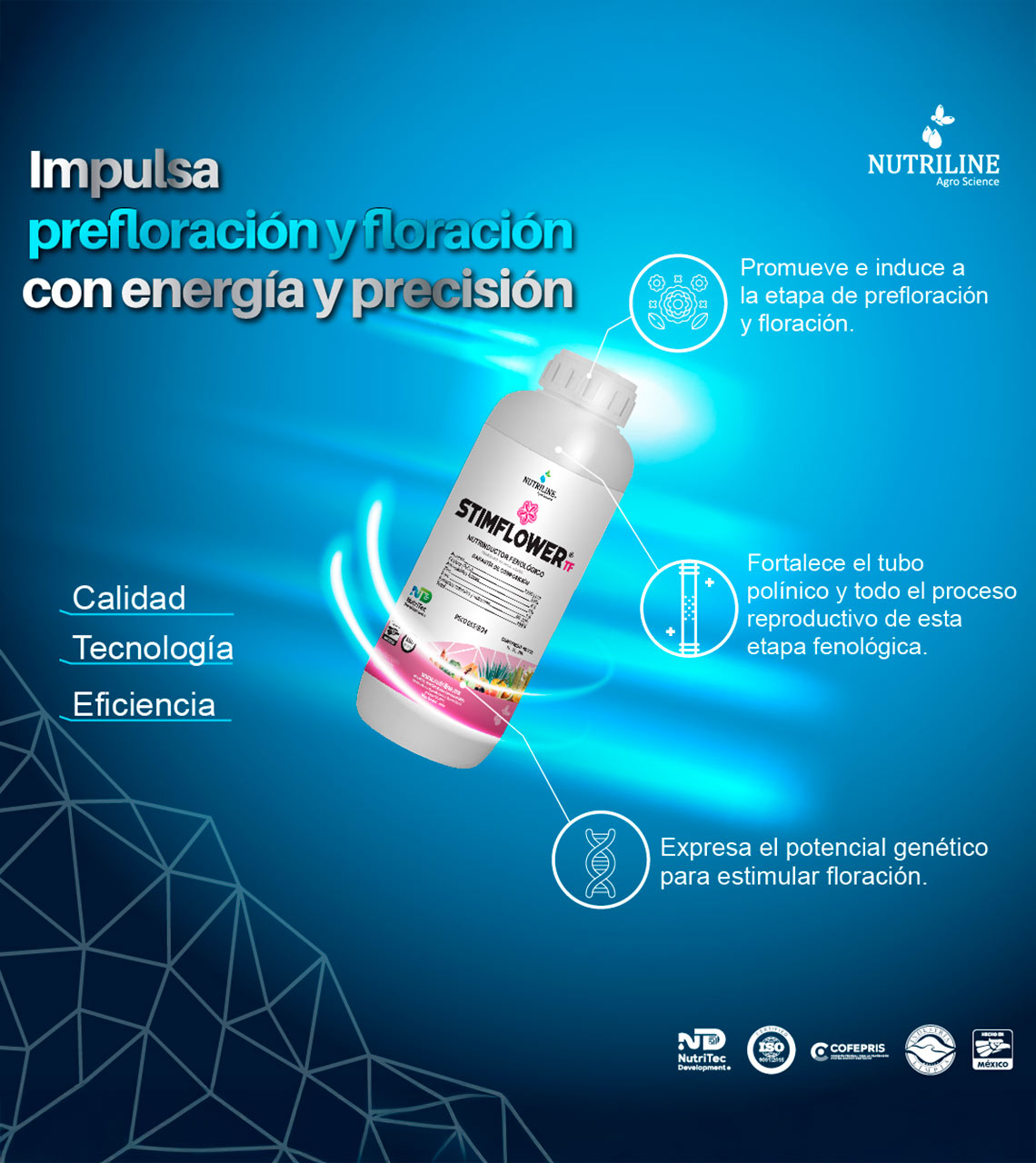 STIMFLOWER TF® es un nutrinductor para prefloración y floración en forma líquida concentrado, formulado con la avanzada tecnología NutriTec Development®, ideal para su aplicación vía foliar. Su avanzada formulación a base de fitohormonas, fósforo, micronutrientes esenciales, energizantes y reductores de nitratos promueven e inducen a la etapa fenológica de prefloración y floración en las plantas.