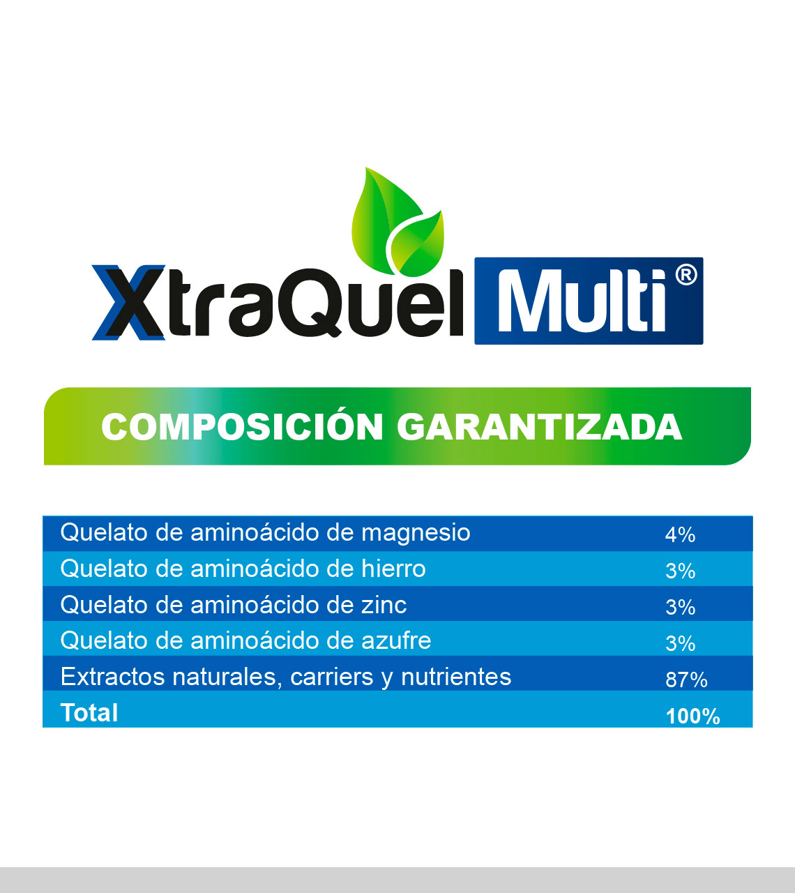 Xtraquel Multi® contiene un compuesto quelatante híbrido que proporciona estabilidad y eficiencia. Contiene un balance de magnesio, fierro, zinc y azufre con tecnología NutriTec Development®. Con su alta concentración de estos micronutrientes y el aporte de carriers orgánicos aseguran su asimilación y translocación. Indicado para prevenir y corregir deficiencias causadas por la escasez o inadecuada asimilación de estos nutrientes en las plantas.