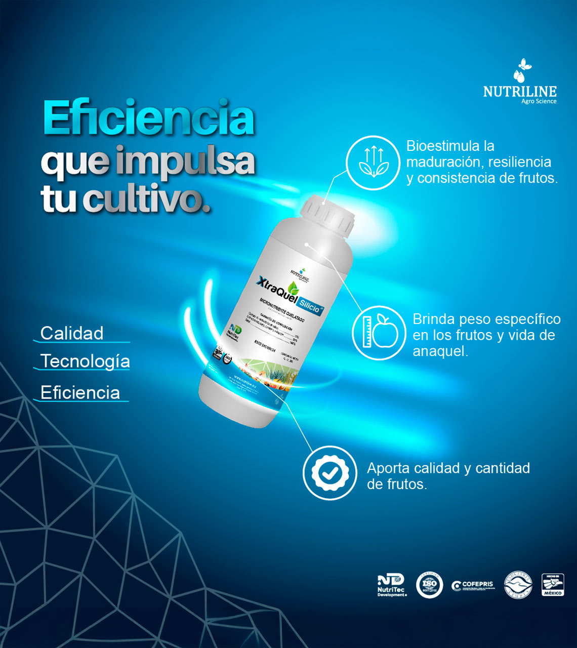 Xtraquel Silicio® contiene un compuesto quelatante híbrido que proporciona estabilidad y eficiencia. Contiene un balance de Silicio con tecnología NutriTec Development®. Con su alta concentración de este micronutriente y el aporte de carriers orgánicos aseguran su asimilación y translocación. Indicado para prevenir y corregir deficiencias causadas por la escasez o inadecuada asimilación de este nutriente en las plantas. Es ideal para la etapa de fructificación y vida de anaquel de frutos.